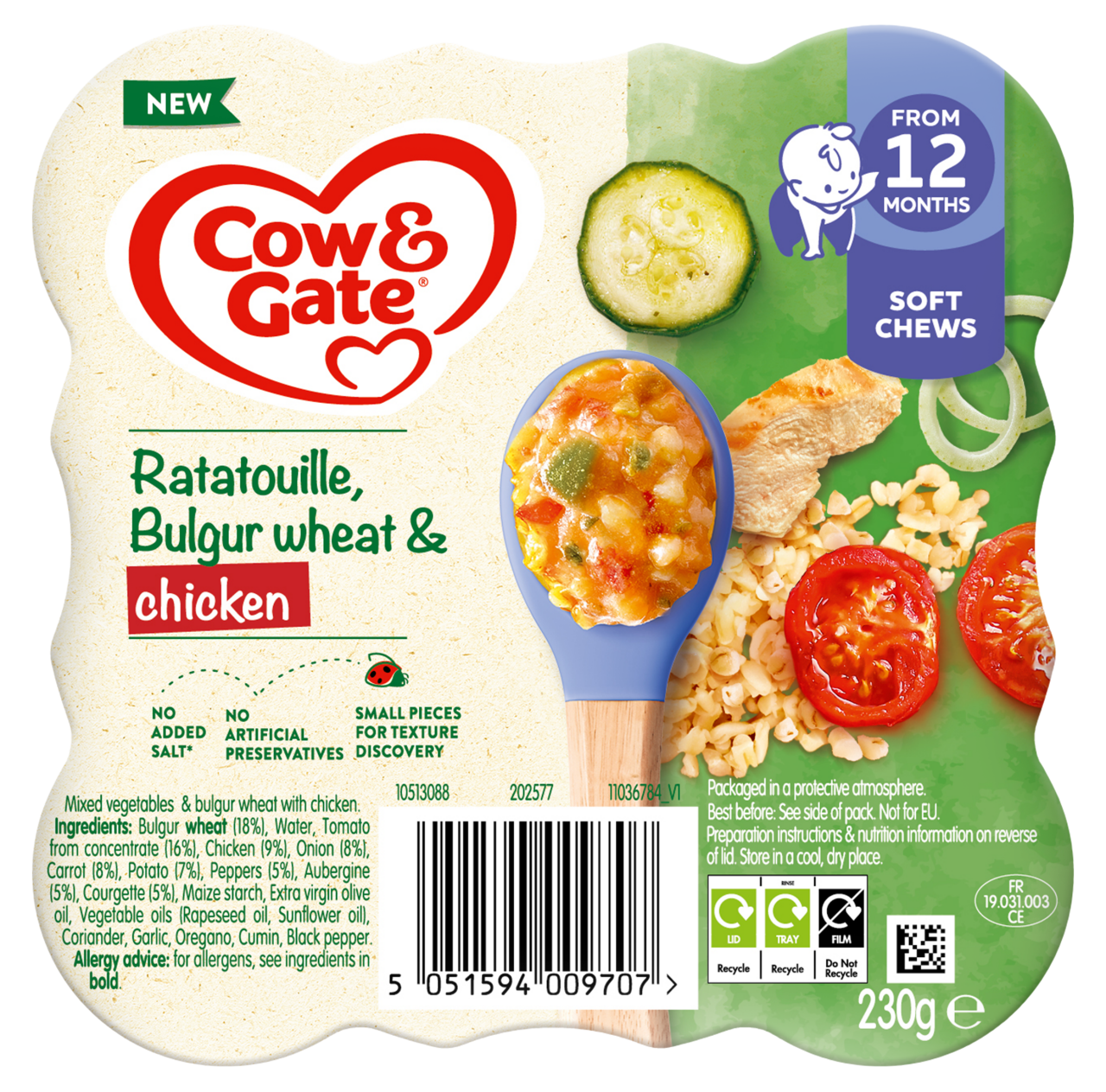 A flavorful adventure! Our Ratatouille, Bulgur Wheat & Chicken meal offers varied textures for toddlers to explore, with fiber and no added salt*.