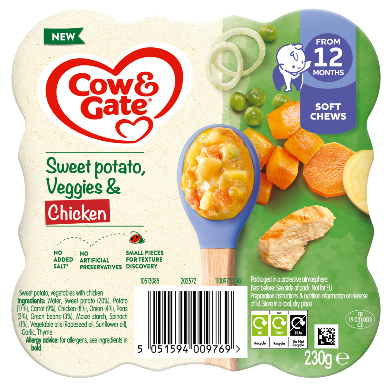 Veggie & chicken goodness! Our Sweet Potato, Veggies & Chicken meal offers varied pieces for toddlers to explore, with fiber and no added salt*.