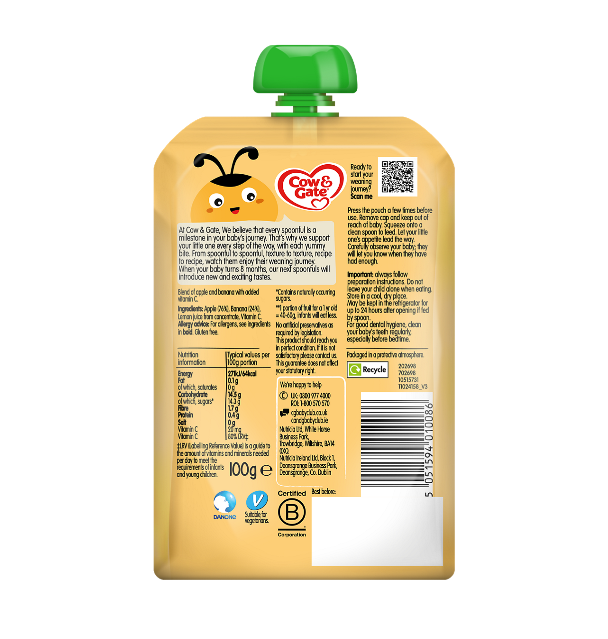 At Cow & Gate, we believe every spoonful is a milestone in your baby’s weaning journey. That’s why we support your little one every step of the way. Discover our apple and banana baby food pouch, perfect for those first tastes and textures. A yummy blend of real fruits, lemon juice and vitamin C – simple.
