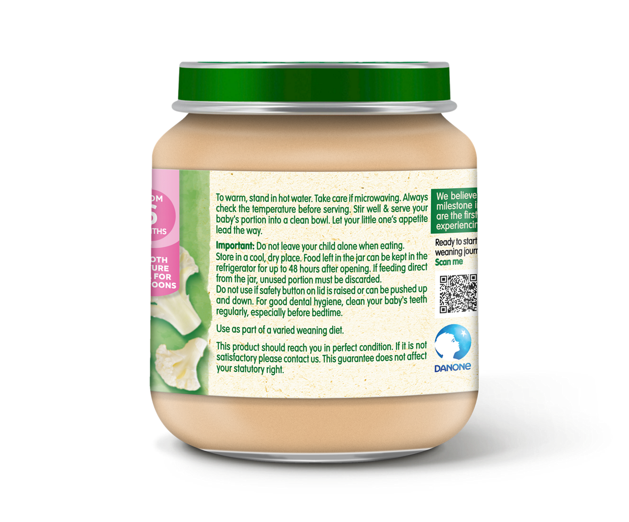 At Cow & Gate, we believe every spoonful is a milestone in your baby’s weaning journey. That’s why we support your little one every step of the way. Our cauliflower baby food jar has a smooth texture, and is made for veggie discovery so you can experience their first tastes together.