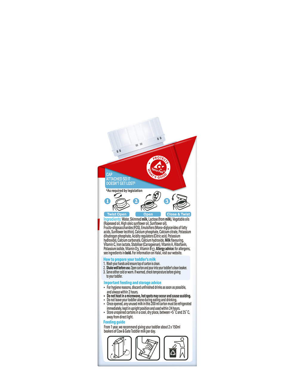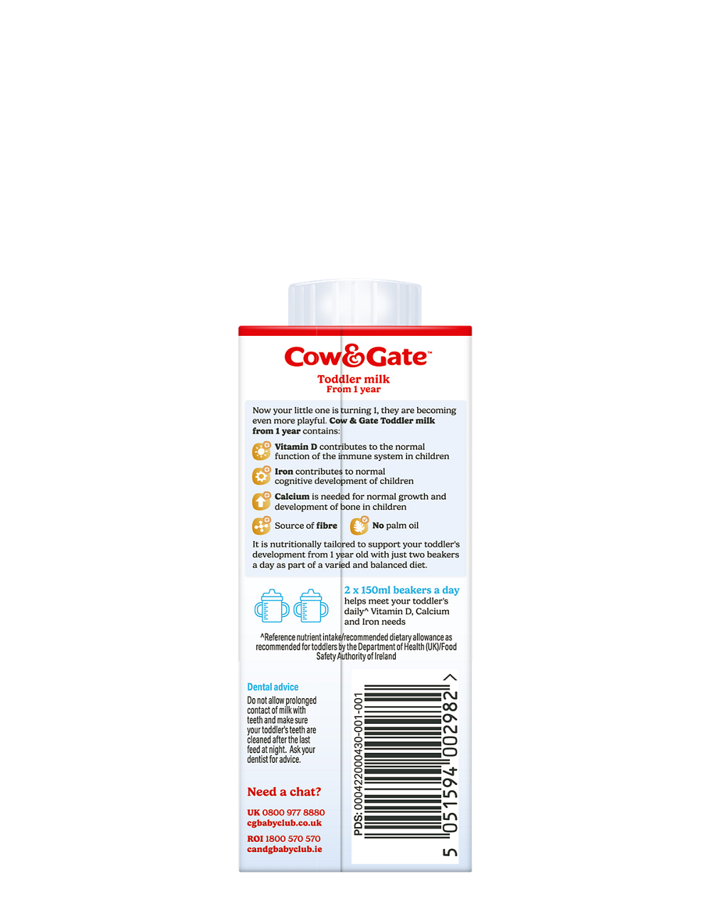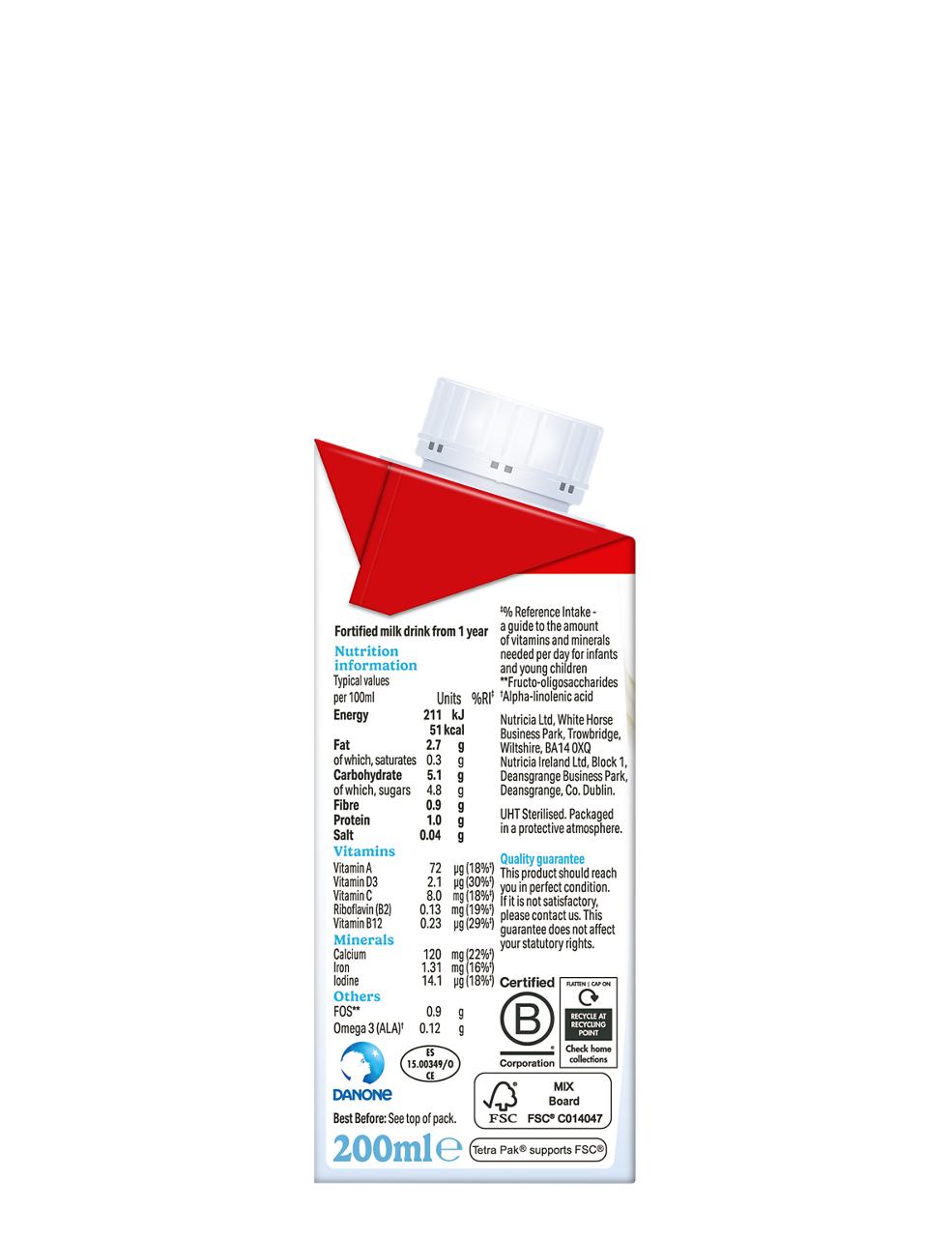 Now your little one is turning 1, they’re becoming even more playful. Our Toddler Milk 200ml is nutritionally tailored to support your toddler’s development from 1 year old with just 2 beakers a day as part of a varied and balanced diet. Founded in Britain with over 100 years of trusted experience, our Toddler milk contains no artificial preservatives or palm oil. It is a source of Vitamins A, C & D and is enriched with Calcium for normal bone development.