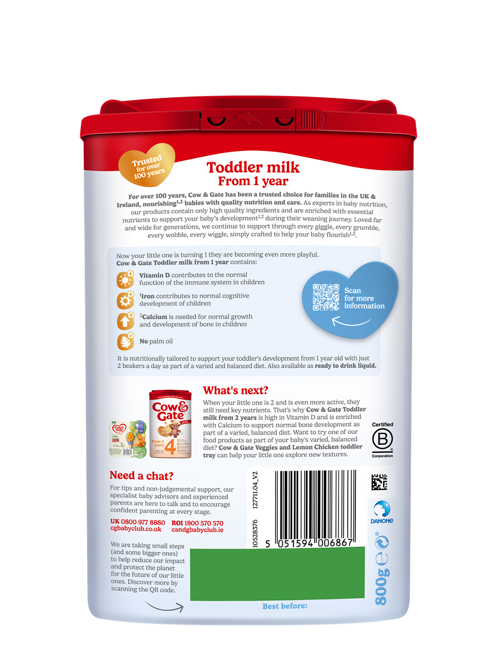 Now your little one is turning 1, they’re becoming even more playful. Our Toddler Milk 800g is nutritionally tailored to support your toddler’s development from 1 year old with just 2 beakers a day as part of a varied and balanced diet. Founded in Britain with over 100 years of trusted experience, our Toddler milk contains no artificial preservatives or palm oil. It is a source of Vitamins A, C & D and is enriched with Calcium for normal bone development.