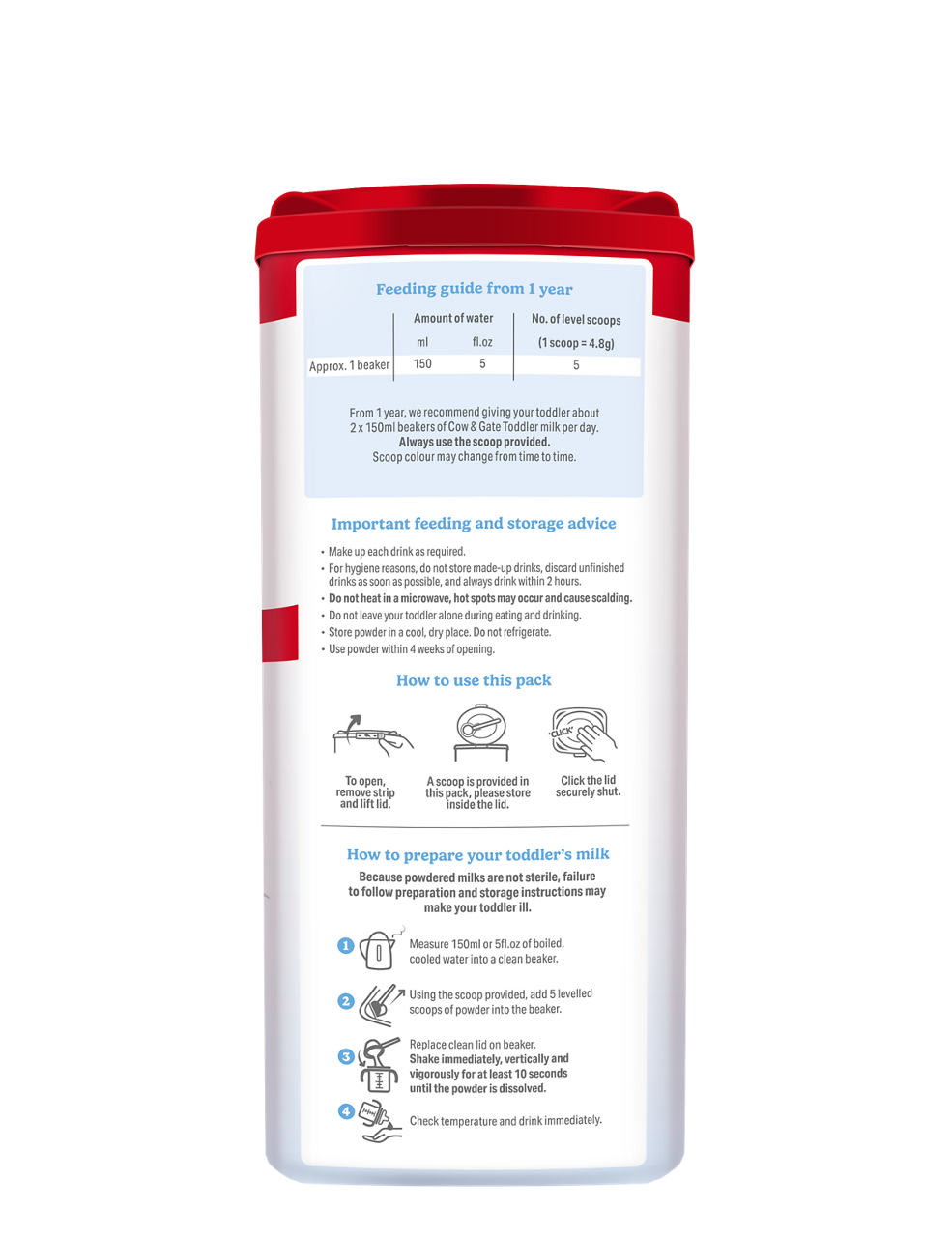 We recommend giving your toddler about 2 x 150ml beakers of Cow & Gate Toddler milk a day, as part of a varied, balanced diet from 1 year.