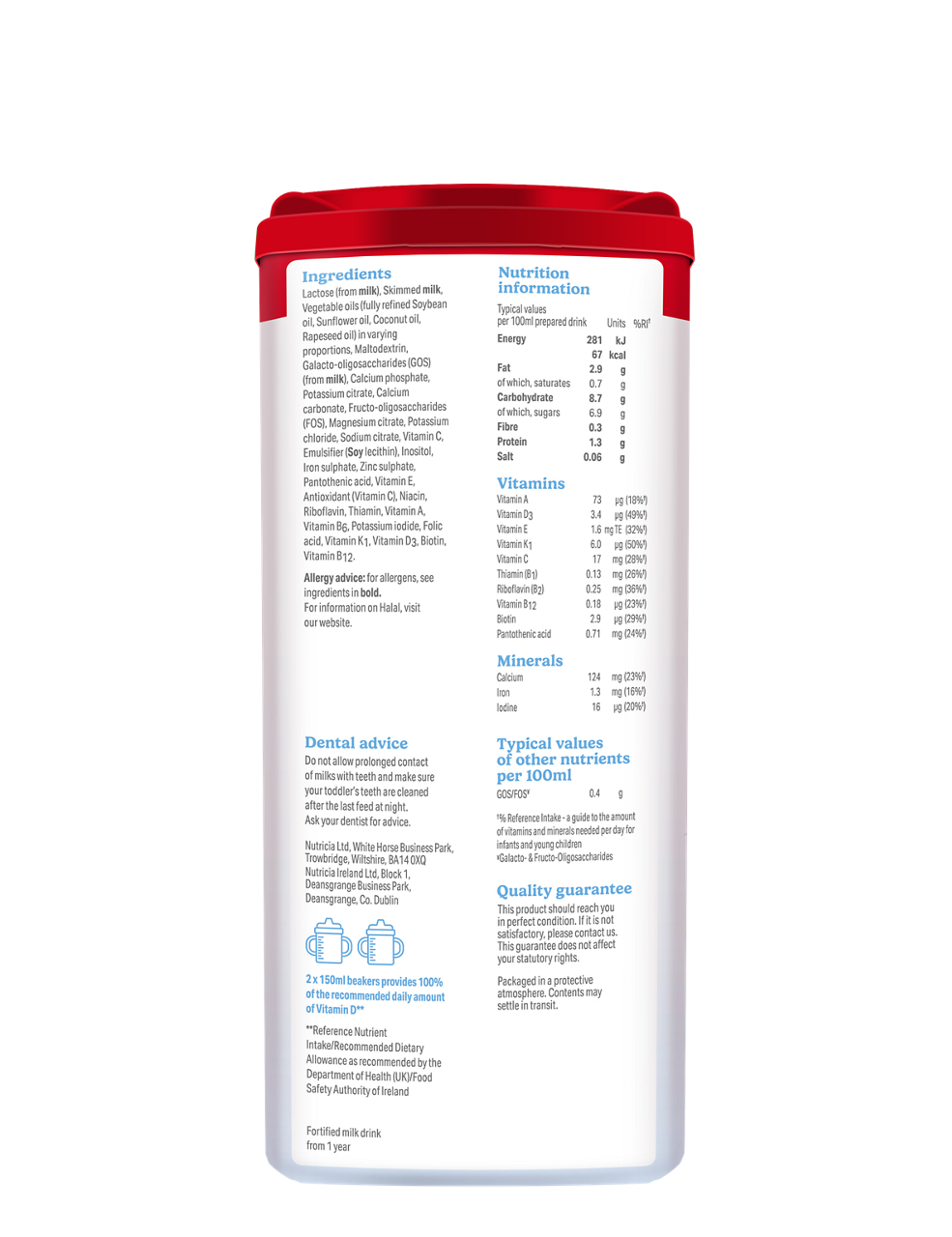 Lactose (from milk), Skimmed milk, Vegetable oils (Fully refined soybean oil, Sunflower oil, Coconut oil, Rapeseed oil) in varying proportions, Maltodextrin, Galacto-oligosaccharides (GOS) (from milk), Calcium phosphate, Potassium citrate, Calcium carbonate, Fructo-oligosaccharides (FOS), Magnesium citrate, Potassium chloride, Sodium citrate, Vitamin C, Emulsifier (Soy lecithin), Inositol, Iron sulphate, Zinc sulphate, Pantothenic acid, Vitamin E, Antioxidant (Vitamin C), Niacin, Riboflavin, Thiamin, Vitamin A, Vitamin B6, Potassium iodide, Folic acid, Vitamin K1, Vitamin D3, Biotin, Vitamin B12.