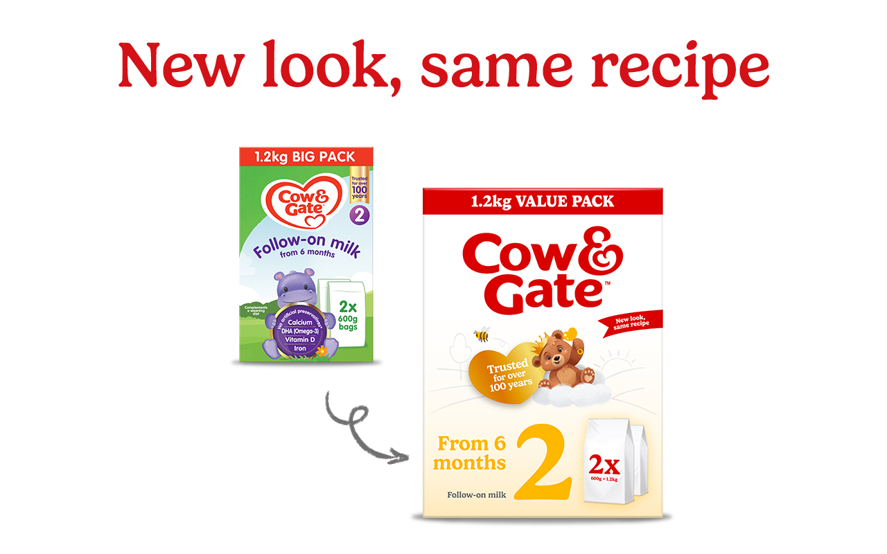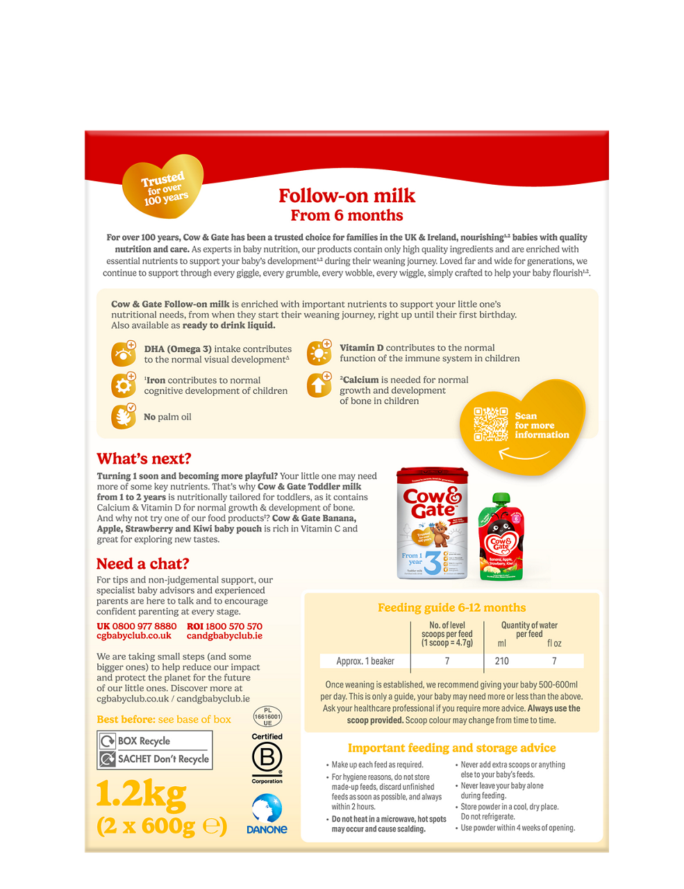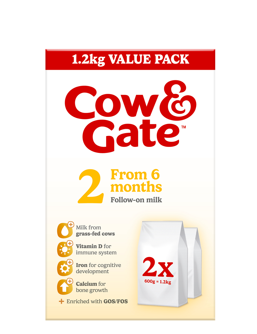 Cow & Gate Follow-on Milk 2x600g is our best value pack, with each feed costing 20% less* than our 800g pack. It is formulated for babies from 6-12 months. It contains no palm oil and provides important nutrients such as Vitamin D, Iron, Calcium and DHA (Omega 3) to support your little one as they move onto a varied weaning diet.