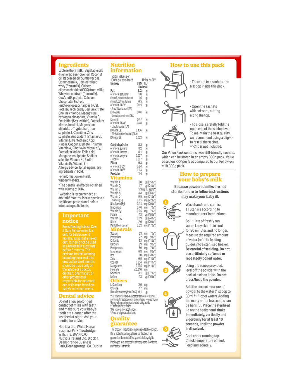 Lactose (from milk), Vegetable oils (High oleic sunflower oil, Coconut oil, Rapeseed oil, Sunflower oil), Skimmed milk, Demineralised whey (from milk), Galacto-oligosaccharides (GOS) (from milk), Whey concentrate (from milk), Cow's milk protein, Calcium phosphate, Fish oil, Fructo-oligosaccharides, Potassium chloride, Sodium citrate, Choline chloride, Magnesium hydrogen phosphate, Vitamin C, Emulsifier (Soy lecithin), Potassium citrate, Inositol, Magnesium chloride, L-Tryptophan, Iron sulphate, L-Carnitine, Zinc sulphate, Antioxidant (Vitamin C), Vitamin E, Pantothenic Acid, Niacin, Copper sulphate, Thiamin, Vitamin A, Riboflavin, Vitamin B6, Potassium iodide, Folic acid, Manganese sulphate, Sodium selenite, Vitamin K1, Biotin, Vitamin D3, Vitamin B12.