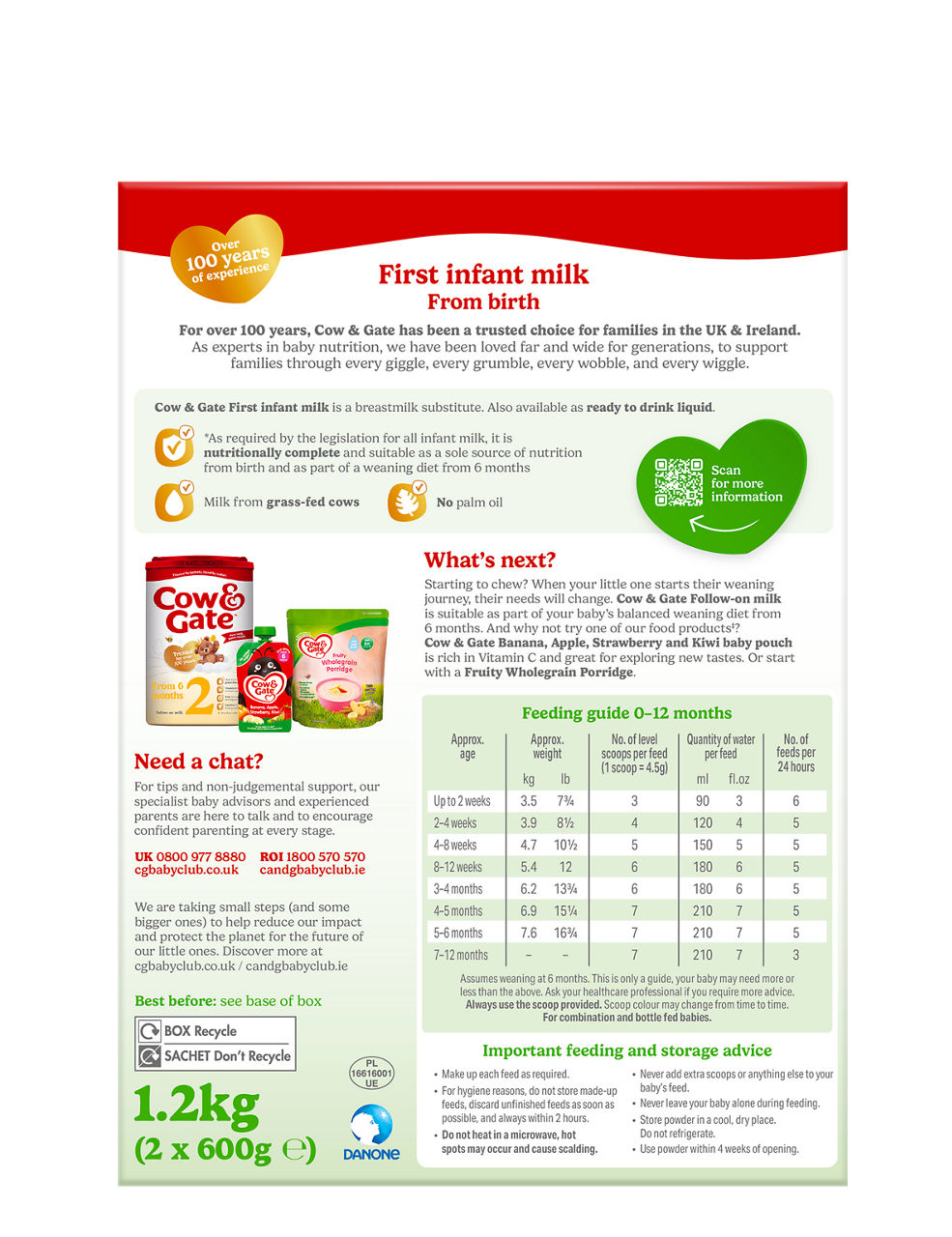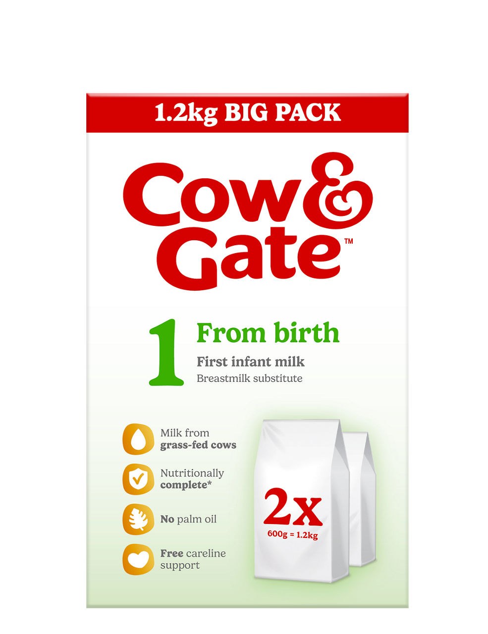 Cow & Gate First Infant Milk Formula Powder 1.2kg Big Pack is made with milk from grass-fed cows, contains no palm oil and is a nutritionally complete breastmilk substitute. It can be used as a sole source of nutrition from when your baby is born or as part of a mixed weaning diet from 6 months.