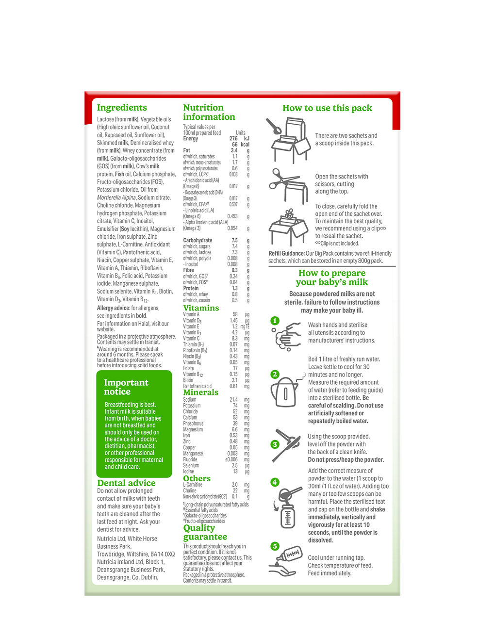Lactose (from milk), Vegetable oils (High oleic sunflower oil, Coconut oil, Rapeseed oil, Sunflower oil), Skimmed milk, Demineralised whey (from milk), Whey concentrate (from milk), Galacto-oligosaccharides (GOS) (from milk), Cow's milk protein, Fish oil, Calcium phosphate, Fructo-oligosaccharides (FOS), Potassium chloride, Oil from Mortierella Alpina, Sodium citrate, Choline chloride, Magnesium hydrogen phosphate, Potassium citrate, Vitamin C, Inositol, Emulsifier (Soy lecithin), Magnesium chloride, Iron sulphate, Zinc sulphate, L-Carnitine, Antioxidant (Vitamin C), Pantothenic acid, Niacin, Copper sulphate, Vitamin E, Vitamin A, Thiamin, Riboflavin, Vitamin B6, Folic acid, Potassium iodide, Manganese sulphate, Sodium selenite, Vitamin K1, Biotin, Vitamin D3, Vitamin B12.