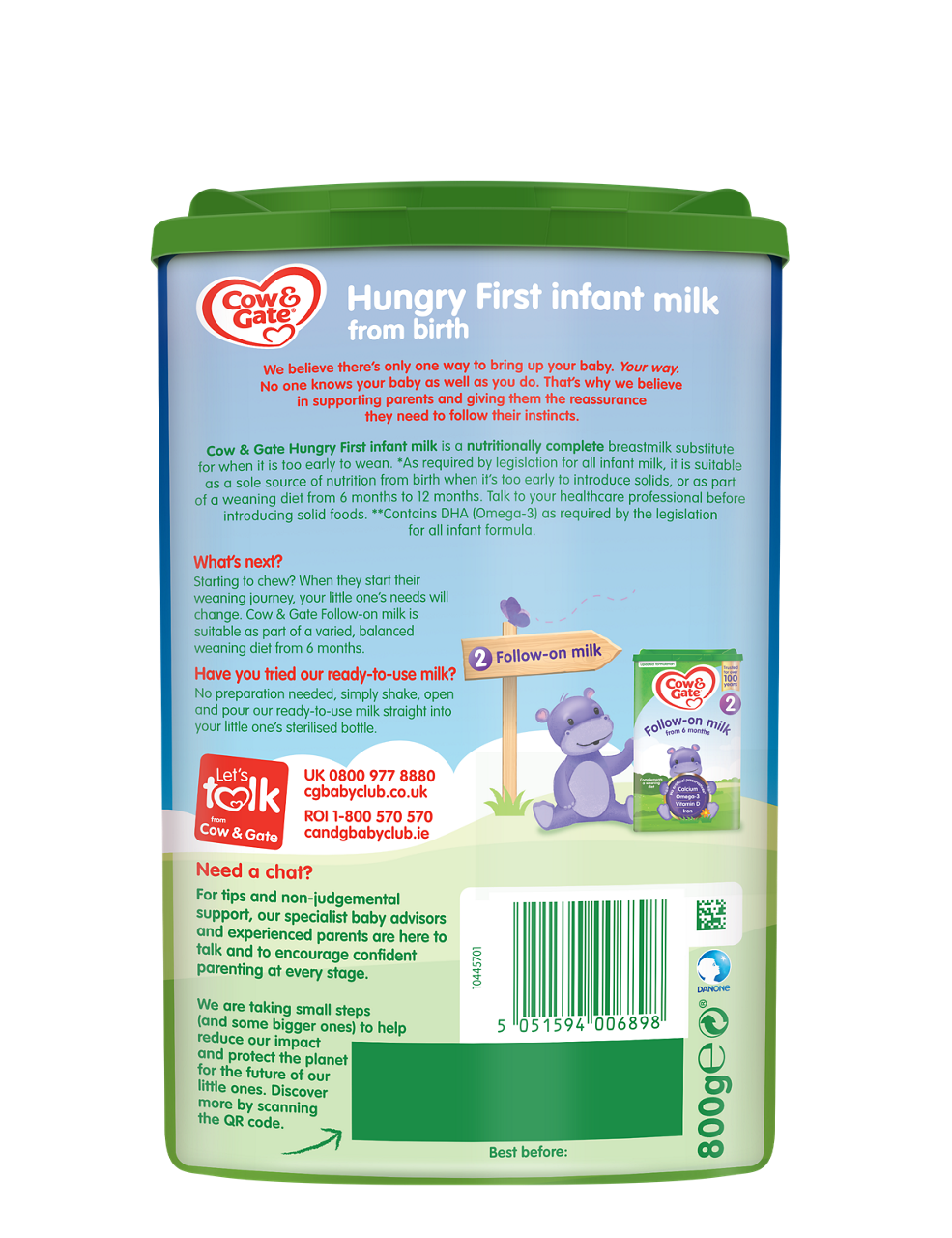 Cow & Gate Hungry First Infant Milk 800g is designed for when it is too early to wean. It is made with milk from grass-fed cows, contains no palm oil and is nutritionally complete. It can be used to substitute breastmilk as a sole source of nutrition from when your baby is born or as part of a weaning diet from 6 months.