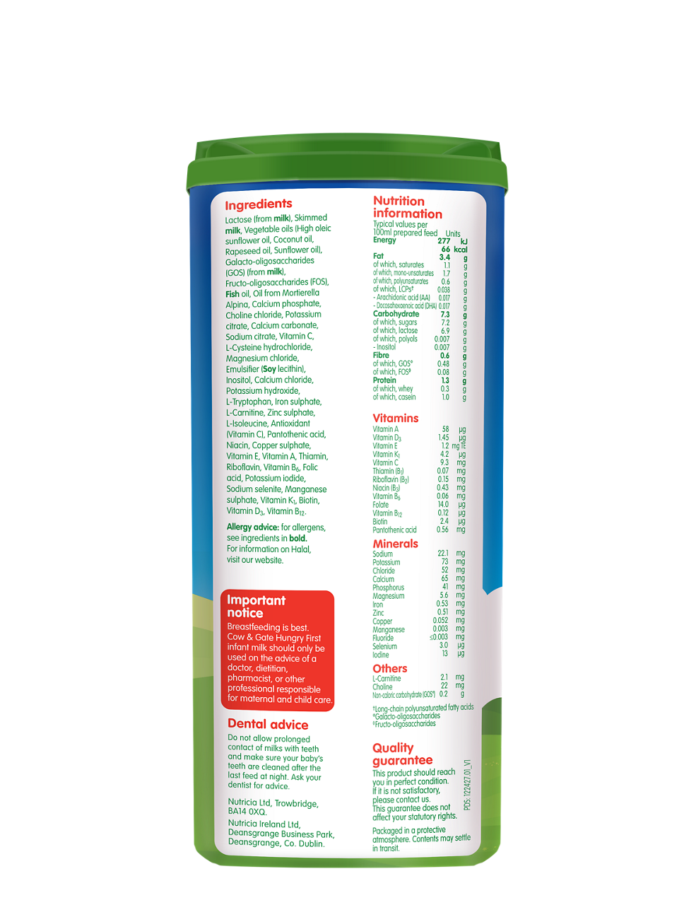 Lactose (from milk), Skimmed milk, Vegetable Oils (High oleic sunflower oil, Coconut oil, Rapeseed oil, Sunflower oil), Galacto-oligosaccharides (GOS) (from milk), Fructo-oligosaccharides (FOS), Fish oil, Oil from Mortierella Alpina, Calcium phosphate, Choline chloride, Potassium citrate, Calcium carbonate, Sodium citrate, Vitamin C, L-Cysteine hydrochloride, Magnesium chloride, Emulsifier (Soy lecithin), Inositol, Calcium chloride, Potassium hydroxide, L-Tryptophan, Iron sulphate, L-Carnitine, Zinc sulphate, L-Isoleucine, Antioxidant (Vitamin C), Pantothenic acid, Niacin, Copper sulphate, vitamin E, Vitamin A, Thiamin, Vitamin B6, Riboflavin, Folic acid, Potassium iodide, Sodium selenite, Manganese sulphate, Vitamin K1, Biotin, Vitamin D3, Vitamin B12.